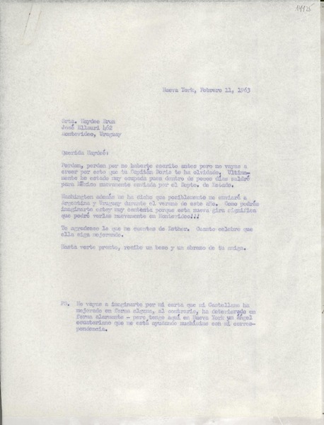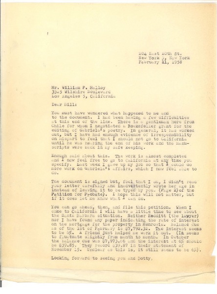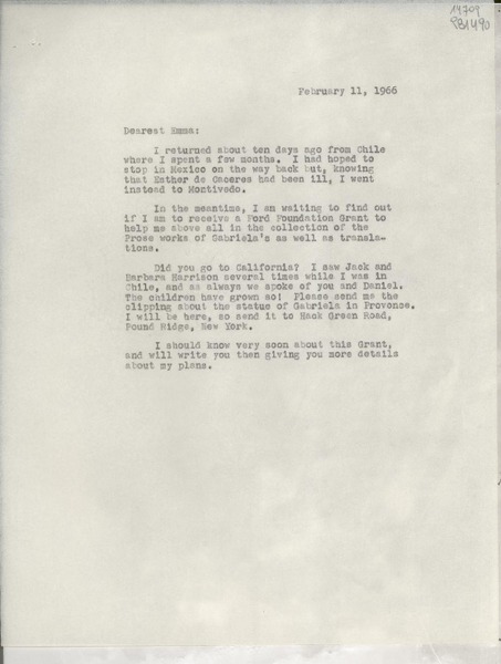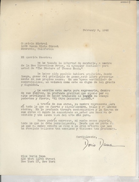 [Carta] 1948 Feb. 9, New York, [EE.UU.] [a] Gabriela Mistral, Monrovia, California, [EE.UU.] [manuscrito] Doris Dana.