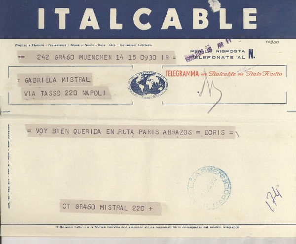 [Telegrama] 1952 jun. 15, Muenchen, [Alemania] [a] Gabriela Mistral, Napoli, [Italia] [manuscrito] Doris [Dana].