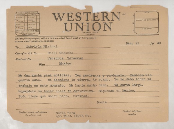 [Telegrama] 1949 dic. 21, New York [a] Gabriela Mistral, Veracruz, México [manuscrito] Doris Dana.