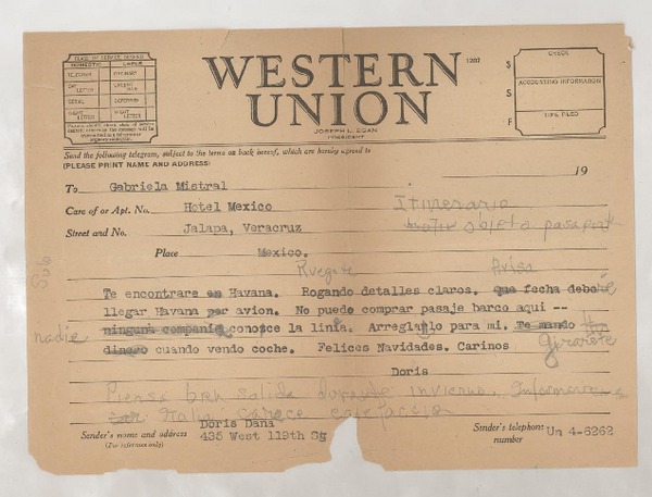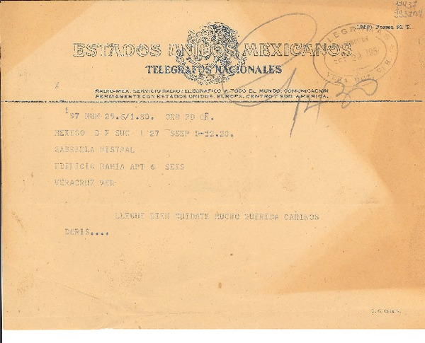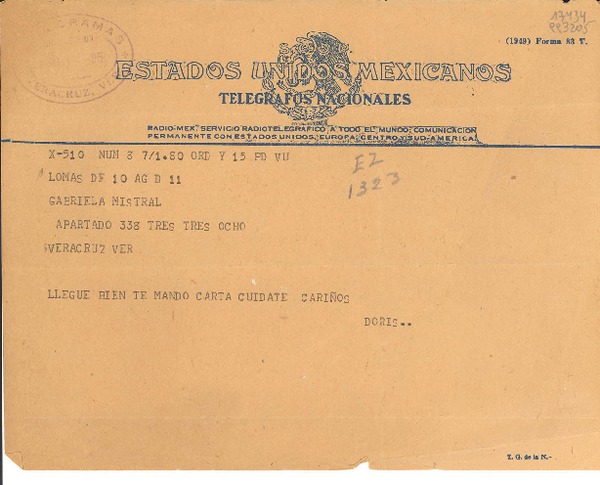 [Telegrama] [1950], [México D. F.] [a] Gabriela Mistral, Veracruz, [México] [manuscrito] Doris [Dana].