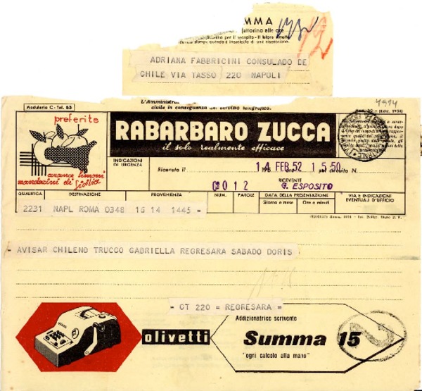 [Telegrama] 1952 feb. 14, Roma [a] Adriana Fabbricini, Nápoles [manuscrito] Doris Dana.