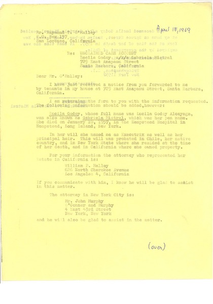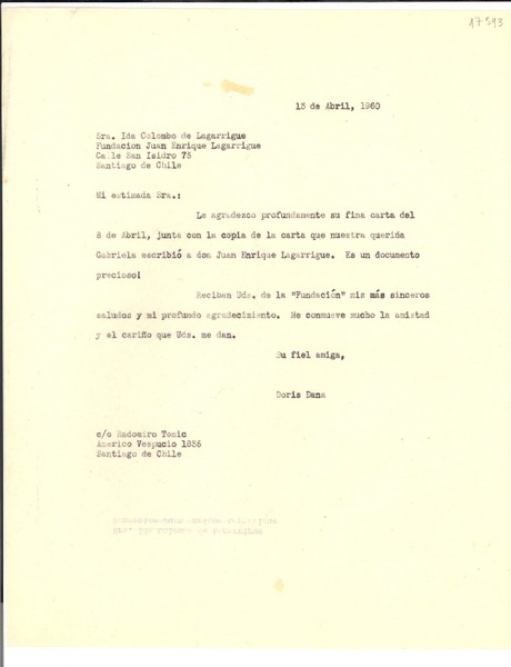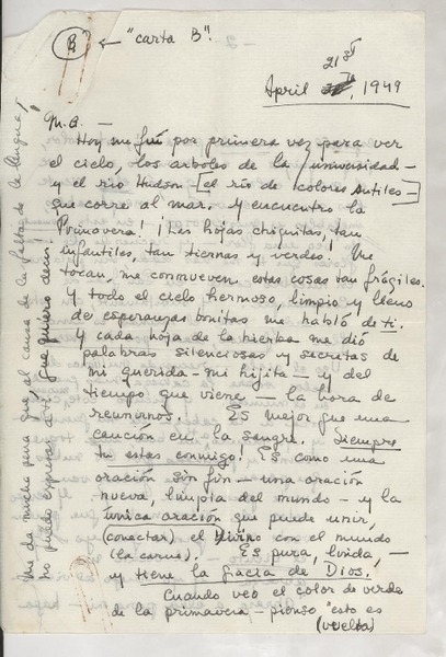 [Carta] 1949 abr. 21 [a] Gabriela Mistral [manuscrito] Doris Dana.
