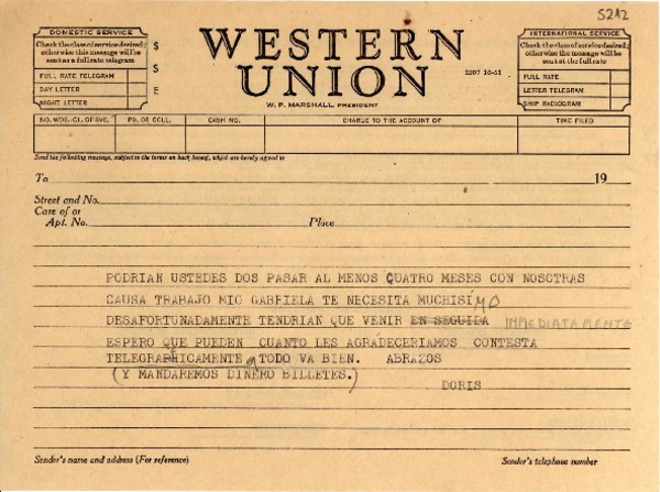 [Telegrama] [1952?], [EE.UU.?] [a] [Palma Guillén de Nicolau], [México] [manuscrito] Doris [Dana].