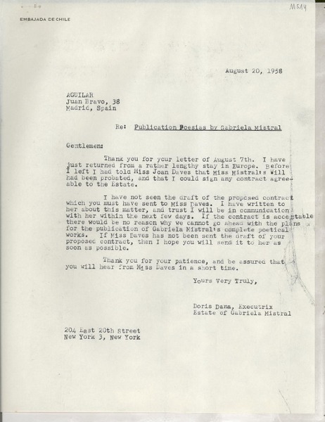 [Carta] 1954 Nov. 18, [EE.UU.] [a] Mario Aguirre Mac-Kay, Editorial del Pacífico S.A., Santiago, Chile [manuscrito] Doris Dana.