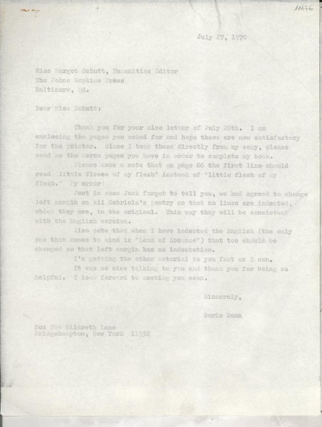 [Carta] 1972 Nov. 23, Box 784, Hildreth Lane, Bridgehampton, New York 11932, [EE.UU.] [a] Miss Julia M. Blanco, Box Mail 1027 Post Hall 30 Third Avenue, Brooklyn, New York 11217, [EE.UU.] [manuscrito] Doris Dana.