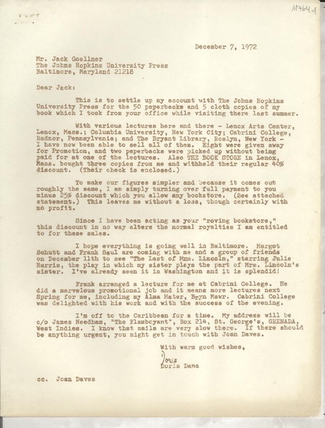 [Carta] 1972 Dec. 7, [EE.UU.] [a] Mr. Jack Goellner, The Johns Hopkins University Press, Baltimore, Maryland, [EE.UU.] [manuscrito] Doris Dana.