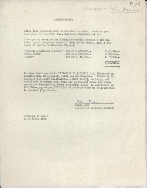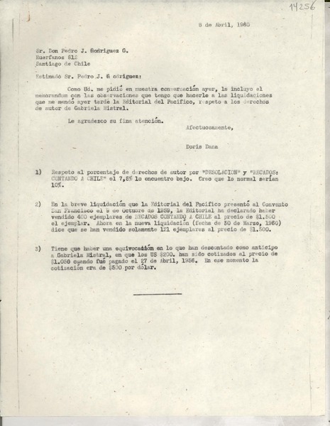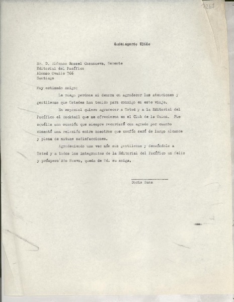 [Carta] [a] Sr. D. Alfonso Rossel Casanueva, Gerente Editorial del Pacífico, Alonso de Ovalle 766, Santiago [manuscrito] Doris Dana.