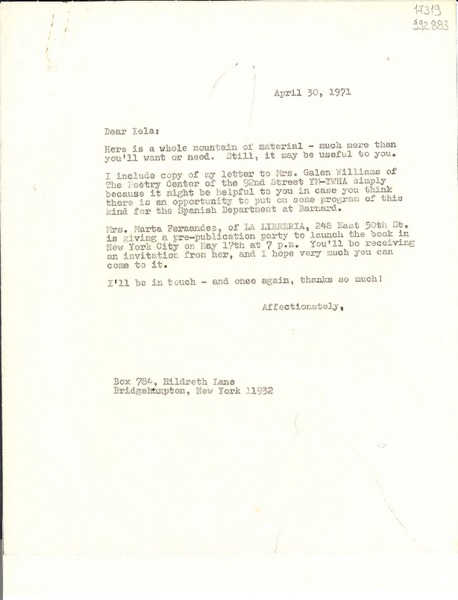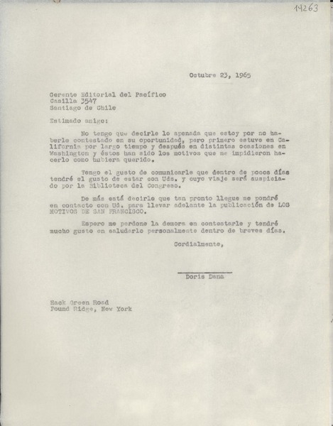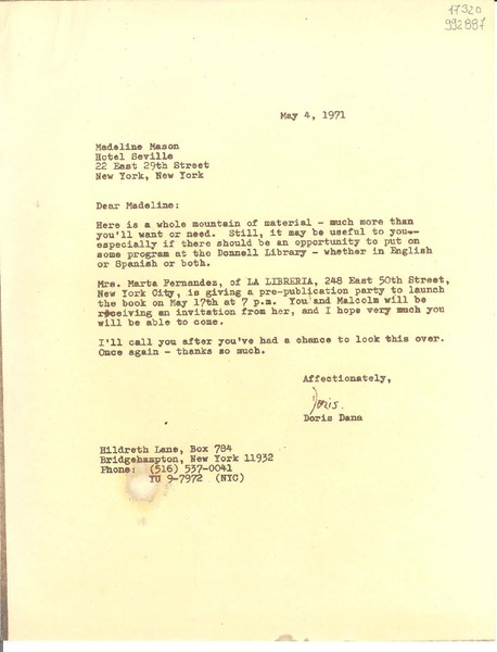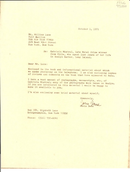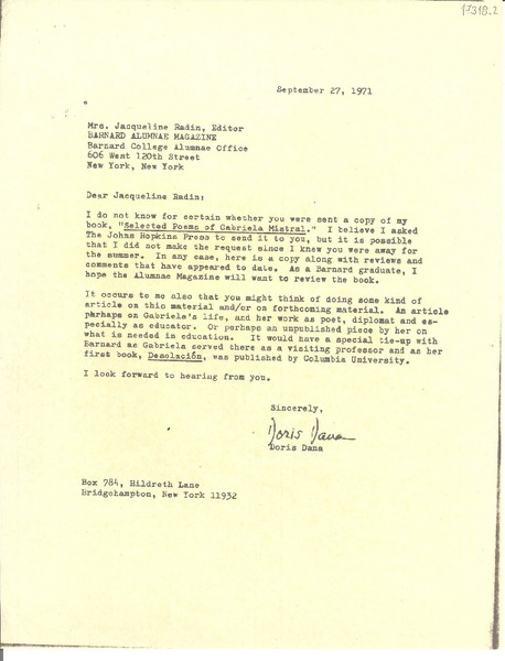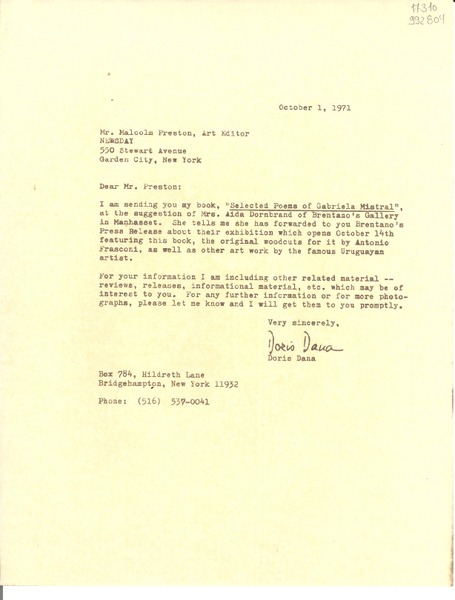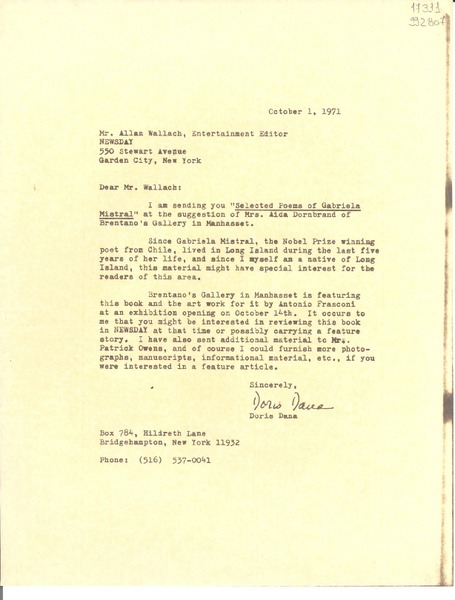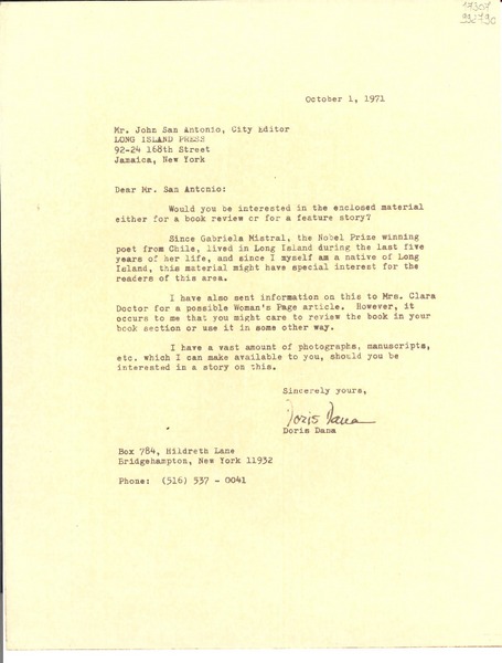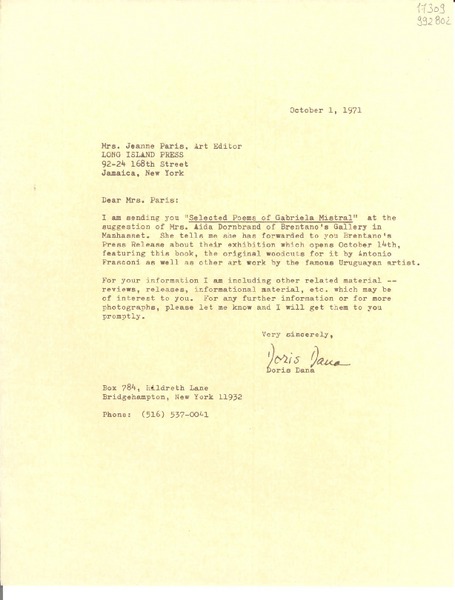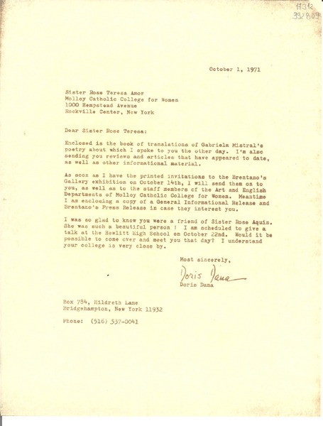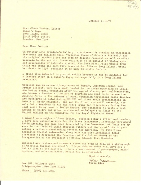 [Carta] 1972 Oct. 14, Hildreth Lane, Box 784, Bridgehampton, L. I., New York, [Estados Unidos] [a] Sra. Zoila María Castro, Corona, L. I., New York [manuscrito] Doris Dana.
