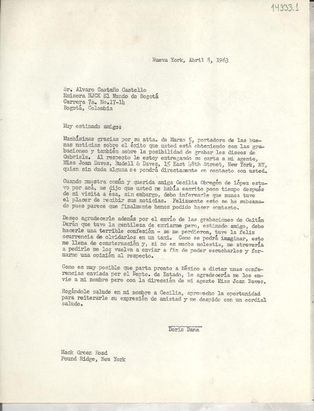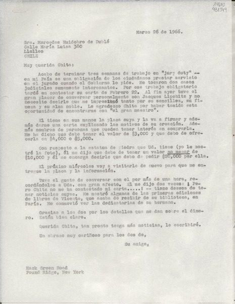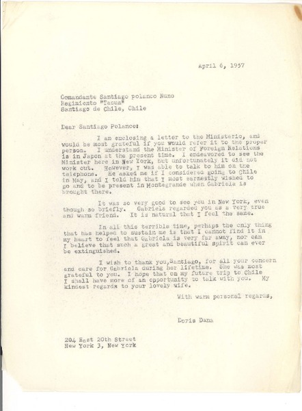 [Carta] 1957, abr. 6, New York [a] Santiago Polanco Nuño, Santiago, Chile [manuscrito] Doris Dana.