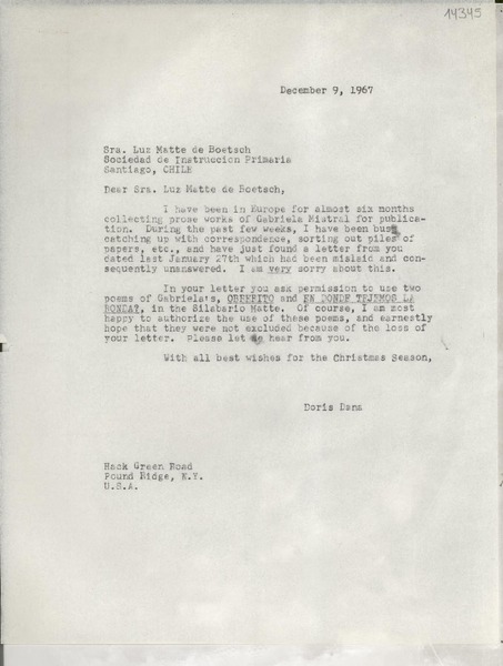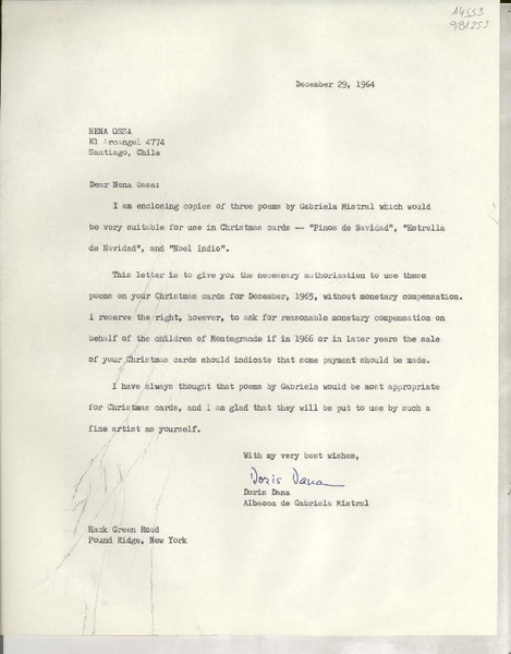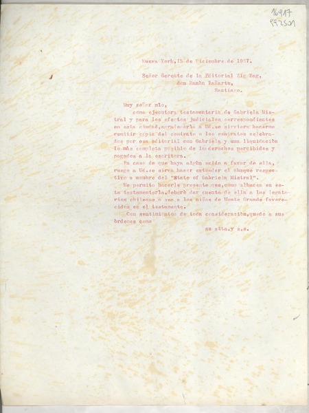 [Carta] 1957 dic. 15, Nueva York, [EE.UU.] [al] Señor Gerente de la Editorial Zig-Zag, don Ramón Zañartu, Santiago, [Chile] [manuscrito] [Doris Dana].