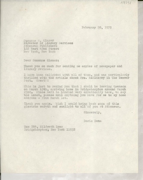 [Carta] 1973 Feb. 20, Box 784, Hildreth Lane, Bridgehampton, New York 11932, [EE.UU.] [a] Suzanne M. Glazer, Director of Library Services, Atheneum Publishers, 122 East 42nd Street, New York, New York, [EE.UU.] [manuscrito] Doris Dana.