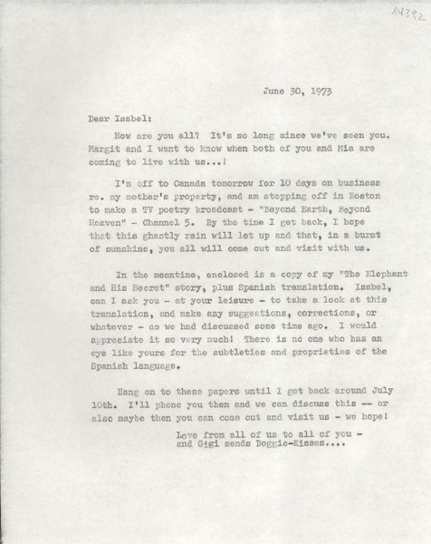[Carta] 1973 June 30, [EE.UU.] [a] Dear Isabel [manuscrito] [Doris Dana].
