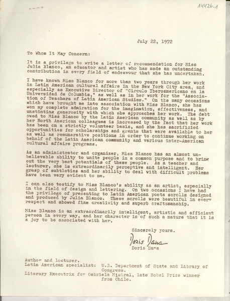 [Carta] 1972 July 22, [EE.UU.] [a] To Whom It May Concern [manuscrito] Doris Dana.