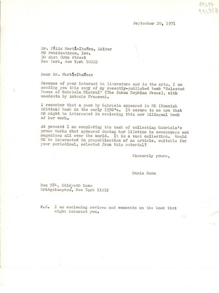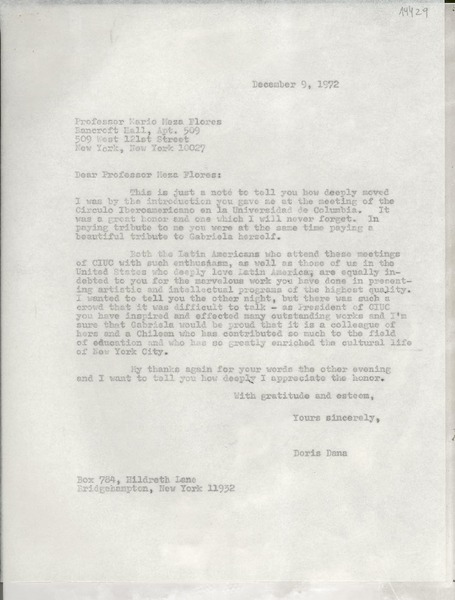[Carta] 1972 Dec. 9, Box 784, Hildreth Lane, Bridgehampton, New York 11932, [EE.UU.] [al] Professor Mario Meza Flores, Bancroft Hall, Apt. 509, 509 West 121st Street New York, New York 10027, [EE.UU.] [manuscrito] Doris Dana.