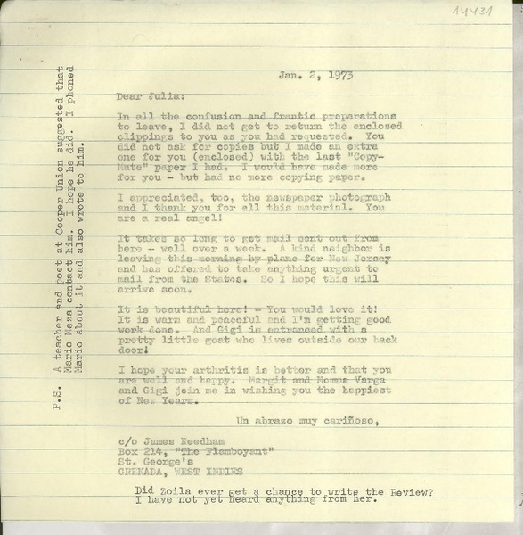 [Carta] 1973 Jan. 2, Grenada, West Indies [a] Dear Julia [M. Blanco] [manuscrito] [Doris Dana].