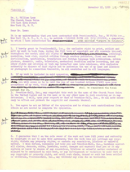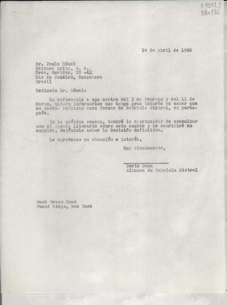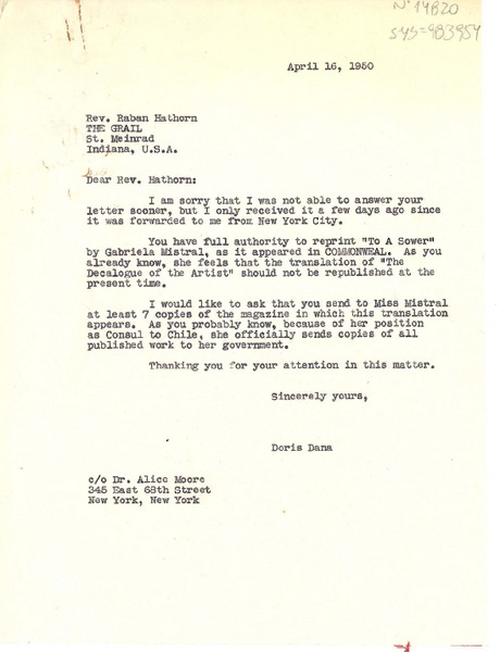 [Carta] 1950 apr. 16, New York, [Estados Unidos] [a] rev. Raban Hathorn, Indiana, U.S.A. [manuscrito] Doris Dana c/o Alice Moore.