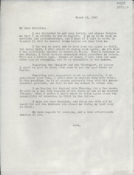 [Carta] 1981 oct. 27, New York [a] Gastón von dem Bussche, Santiago, [Chile] [manuscrito] Doris Dana.
