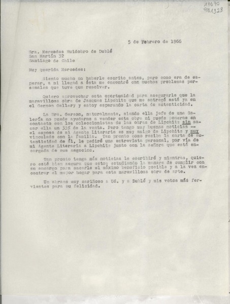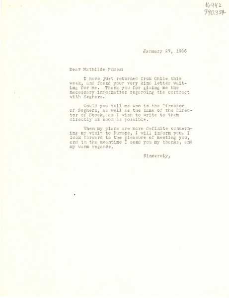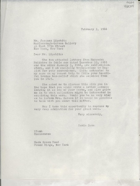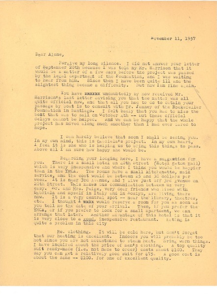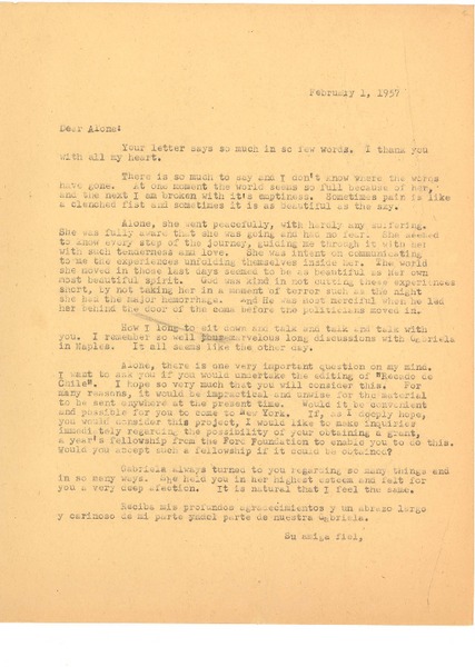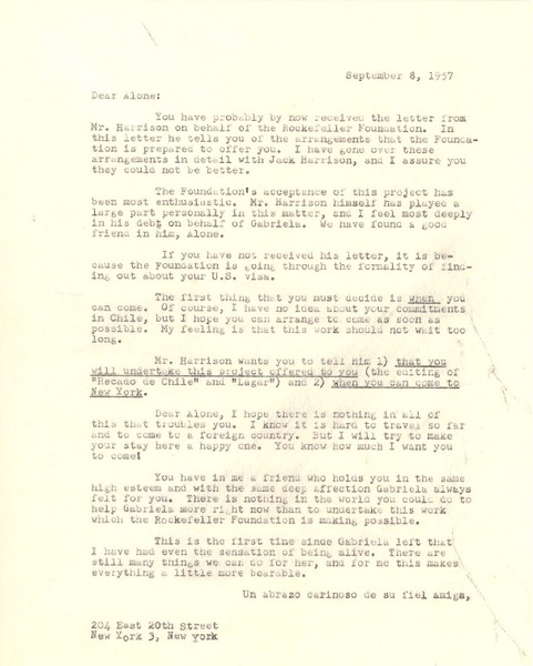 [Carta] 1957 feb. 1, [New York] [a] Alone, [Santiago de Chile] [manuscrito] Doris Dana.