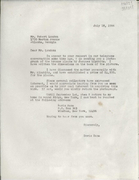 [Carta] 1952 July 9, New York, [EE.UU.] [a] Margarit [i.e. Margaret] Bates, 1601 Argonne Place, N. W., Washington 9, D. C., [EE.UU.] [manuscrito] Doris Dana.