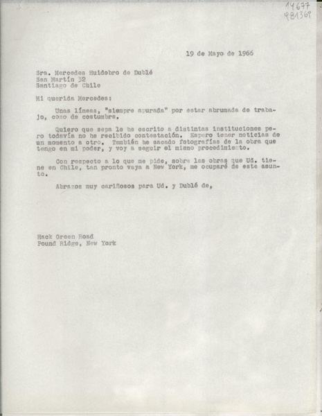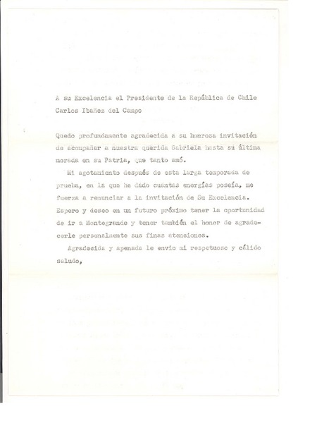 [Carta] c.1958, [New York] [a] Carlos Ibáñez del Campo, Santiago, Chile [manuscrito] Doris Dana.