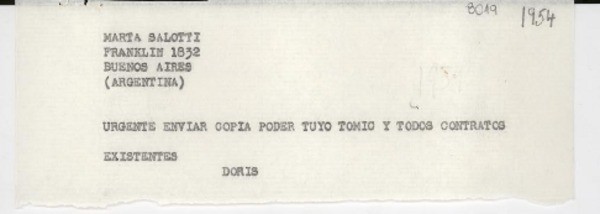 [Carta] [1954] [a] Marta [i.e. Martha] Salotti, Buenos Aires, Argentina [manuscrito] Doris [Dana].