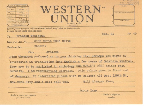 [Telegrama] [1949 dec. 21, [Estados Unidos] [a] Frances Mousseau, Phoenix, Arizona, [Estados Unidos] [manuscrito] Doris Dana.
