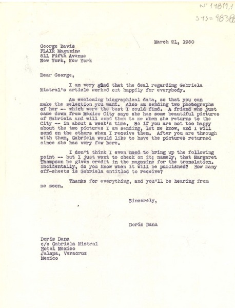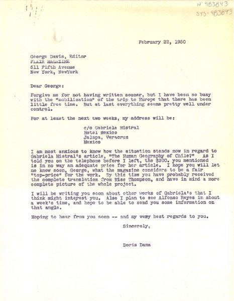 [Carta] 1950 feb. 22, [Estados Unidos] [a] George Davis, Editor Flayr Magazine, New York, [Estados Unidos] [manuscrito] Doris Dana.