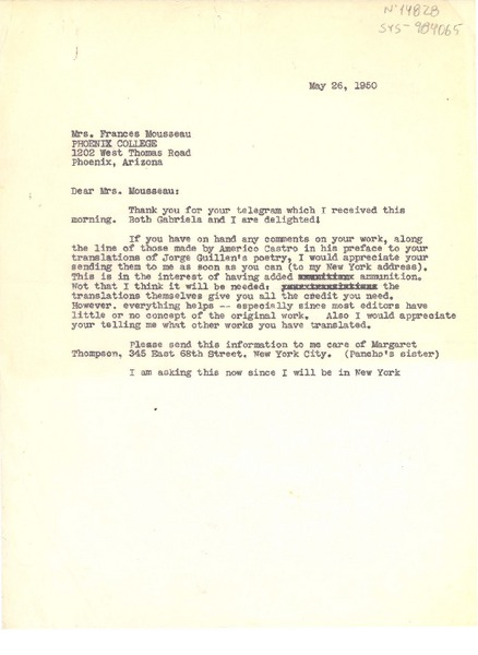 [Telegrama] 1950 may 26, [Estados Unidos] [a] Frances Mousseau, Phoenix, Arizona, [Estados Unidos] [manuscrito] Doris Dana.
