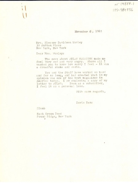 [Carta] 1975 nov. 9, Bridgehampton, New York, [Estados Unidos] [a] Elizabeth Shub, New York, [Estados Unidos] [manuscrito] Doris Dana.