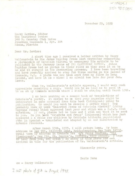 [Carta] 1972 dec. 23, [Estados Unidos] [a] Barry Levine, Miami, Florida, [Estados Unidos] [manuscrito] Doris Dana.