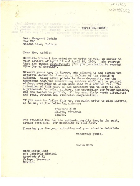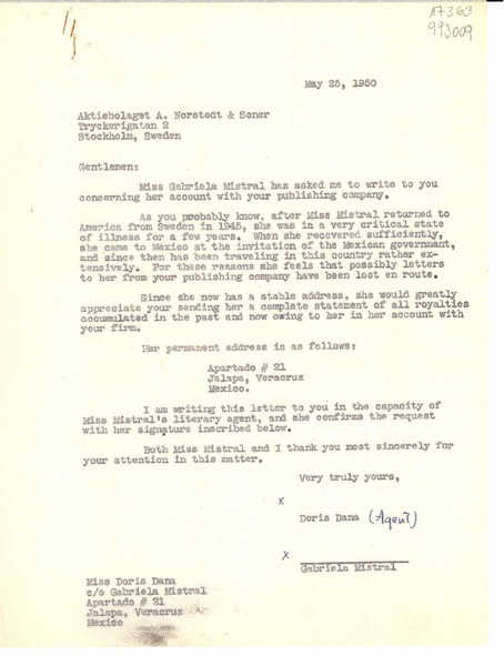 [Carta] 1950 May 25, Apartado # 21, Jalapa, Veracruz, México [a] Aktiebolaget A. Norstedt & Soner, Tryckerigatan 2, Stockholm 2, Sweden [manuscrito] Doris Dana, Agent.