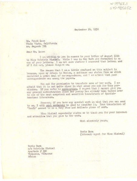 [Carta] 1950 sep. 14, Veracruz, México [a] Frank Lane, Chula Vista, California, [Estados Unidos] [manuscrito] Doris Dana.