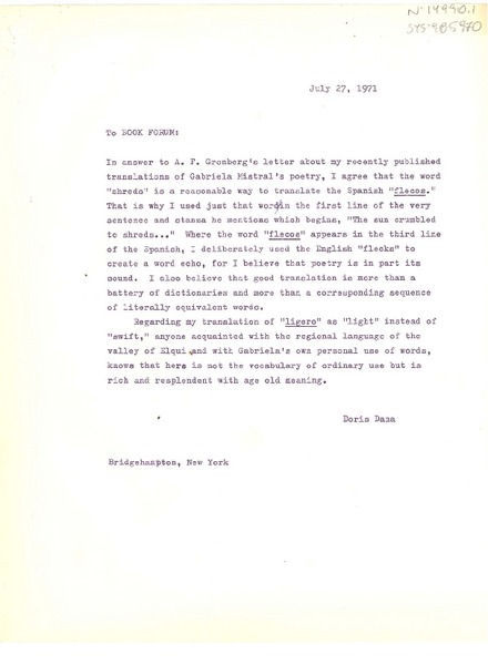 [Carta] 1948 jul. 27, Bridgehampton, New York, [Estados Unidos] [a] Book Forum [manuscrito] Doris Dana.