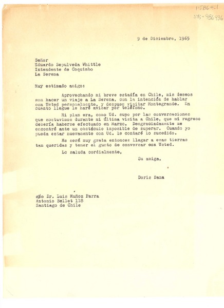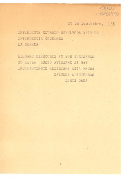 [Telegrama] 1965 dic. 20, [Chile?] [a] Eduardo Sepúlveda Whittle, Intendente de Coquimbo, La Serena, [Chile] [manuscrito] Doris Dana.