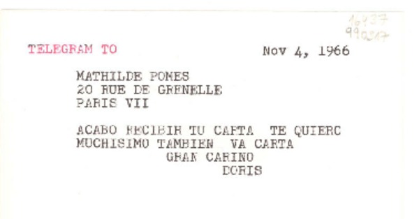 Telegram, 1966 Nov. 4 [a] Mathilde Pomes, 20 Rue de Grenelle, Paris VII, [France] [manuscrito] Doris Dana.