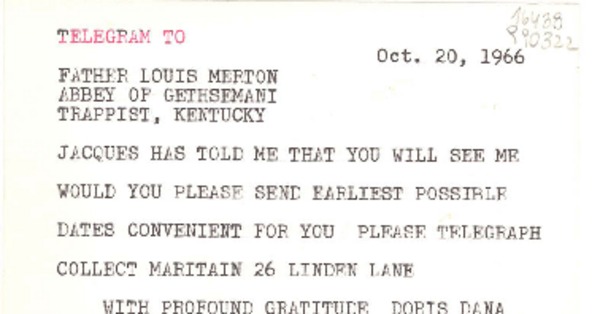 Telegram, 1966 Oct. 20 [al] Father Louis Merton, Abbey of Gethsemani Trappist, Kentucky, [EE.UU.] [manuscrito] Doris Dana.