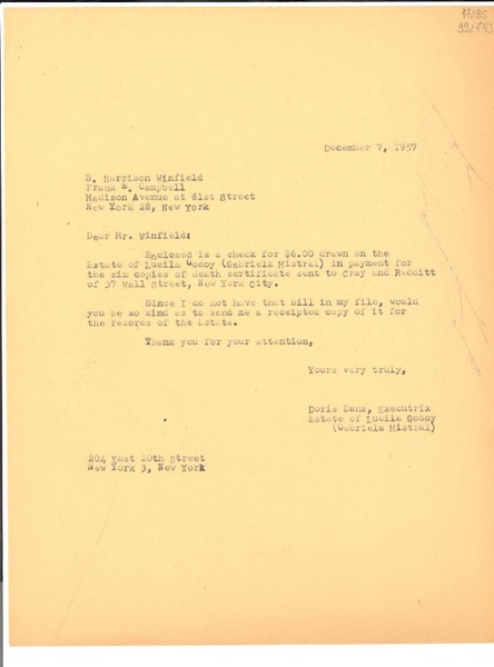 [Carta] 1957 Dec. 7, New York, [Estados Unidos] [a] Harrison Winfield, New York [manuscrito] Doris Dana.
