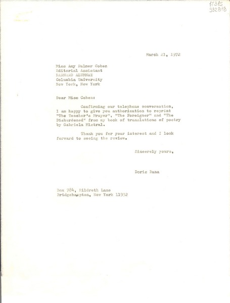 [Carta] 1972 Mar. 21, Bridgehampton, New York, [Estados Unidos] [a] Miss Amy Palmer Cohen [manuscrito] Doris Dana.