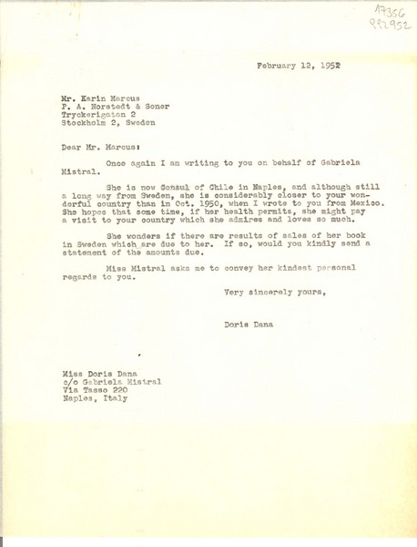 [Carta] 1952 Feb. 12, Via Tasso 220, Naples, Italy [a] Mr. Karin Marcus, P. A. Norstedt & Soner, Tryckerigatan 2, Stockholm 2, Sweden [manuscrito] Doris Dana.