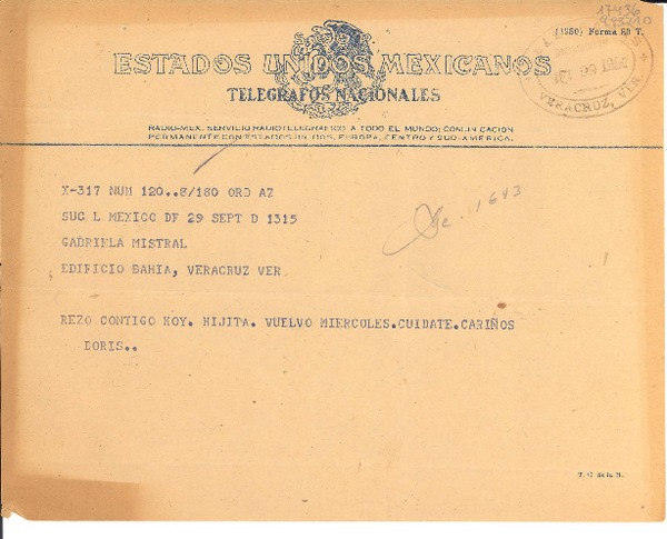 [Telegrama] 1950 sept. 29, México D. F. [a] Gabriela Mistral, Veracruz, [México] [manuscrito] Doris [Dana].