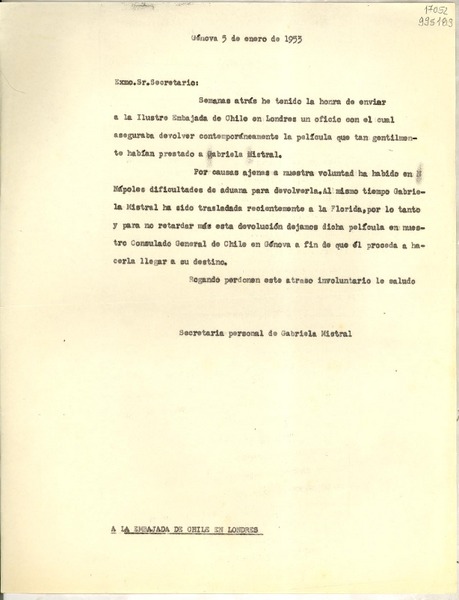 [Carta] 1953 ene. 5, Génova, [Italia] [a] Exmo. Sr. Secretario [manuscrito] Secretaria personal de Gabriela Mistral.