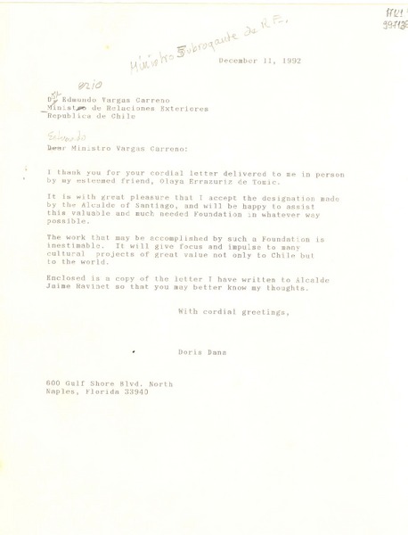 [Carta] 1992 Dec. 11, North Naples, Florida, [Estados Unidos] [a] Don Edmundo Vargas Carreño, Ministro de Relaciones Exteriores, República de Chile [manuscrito] Doris Dana.