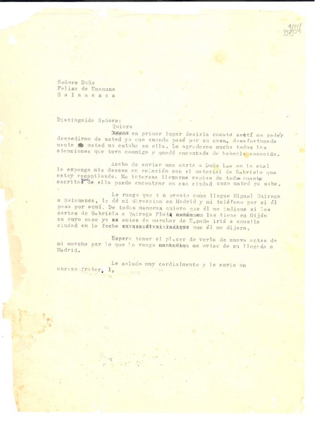 [Carta] [a] Felisa de Unamuno, Salamanca [manuscrito] Doris Dana.