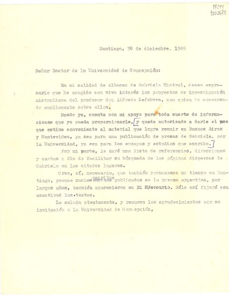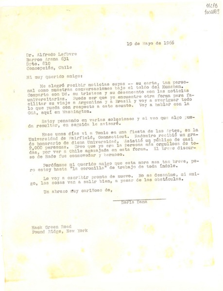 [Telegrama] 1966 ene. 9, [Estados Unidos] [a] Alfredo Lefebvre, Concepción, Chile [manuscrito] Doris Dana.