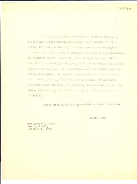 [Carta] 1955 oct. 1, N.Y., [EE.UU.] [a] Presidente Carlos Ibáñez del Campo [manuscrito] Doris Dana.