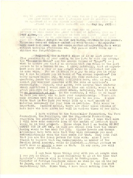 [Carta] 1957 may. 12, [New York] [a] Alone, [Santiago de Chile] [manuscrito] Doris Dana.