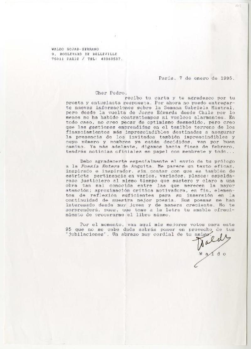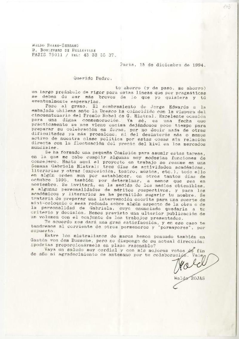Paris, Francia [a] Pedro Lastra, Nueva York Carta, 15 de diciembre 1994, [manuscrito] Waldo Rojas.