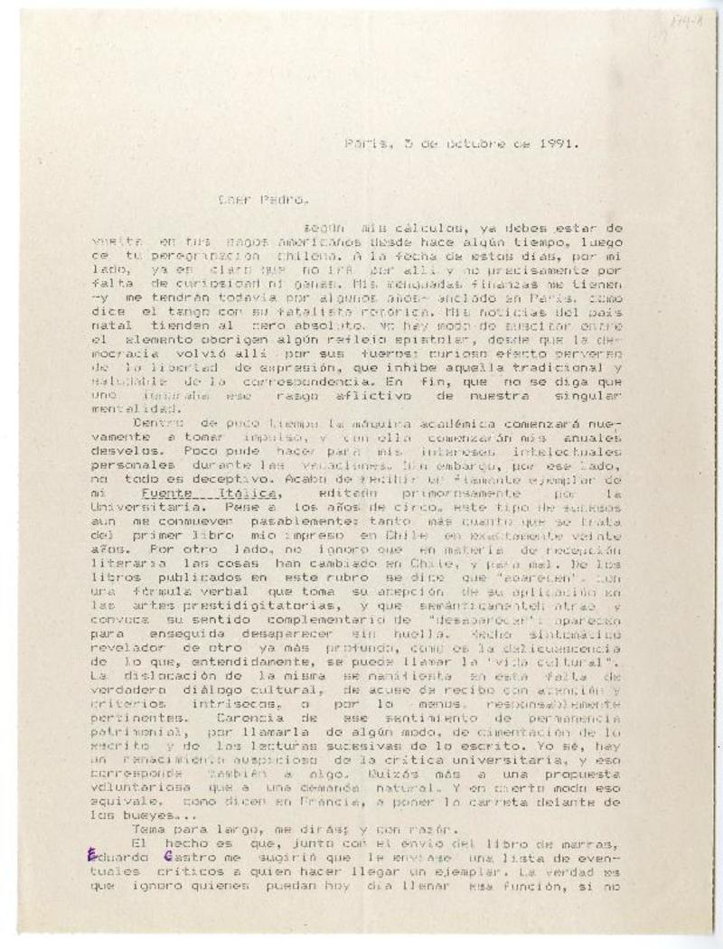 Paris, Francia [a] Pedro Lastra, Nueva York Carta, 5 de octubre 1991, [manuscrito] Waldo Rojas.