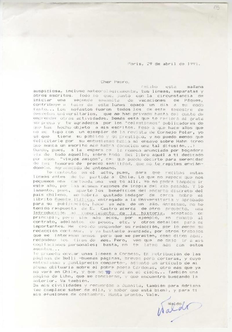 Paris, Francia [a] Pedro Lastra, Nueva York Carta, 29 de abril 1991, [manuscrito] Waldo Rojas.