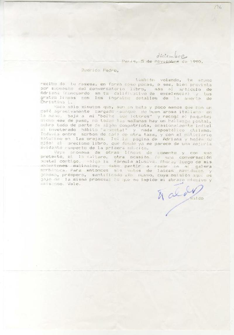 Paris, Francia [a] Pedro Lastra, Nueva York Carta, 5 de diciembre 1990, [manuscrito] Waldo Rojas.
